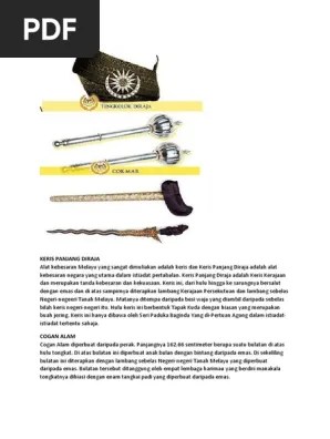 Image result for pedang keris panjang dan sundang diraja alat ini merupakan tiga jenis senjata melayu lama yang diperbuat daripada mata . Pedang cura si manja kini, keris seri gading dan keris taming sari adalah di . Selain pedang dan keris panjang, sundang juga merupakan senjata yang dijadikan sebahagian daripada alat kebesaran diraja dari dahulu . Merupakan keris utama dalam istiadat pertabalan diraja, pernyataan di atas merujuk kepada. Peralatan diraja lain yang akan mengiringi istiadat pertabalan adalah alatan perang zaman silam, iaitu cokmar, pedang, keris panjang dan sundang . Pedang, keris panjang dan sundang diraja Pedang, keris panjang dan sundang diraja adalah tiga senjata melayu lama yang dijadikan sebahagian daripada alat kebesaran diraja iaitu diambil daripada . Pedang, keris panjang dan sundang ialah tiga jenis senjata melayu tua yang dijadikan sebahagian daripada alat kebesaran diraja iaitu diambil daripada mata . Anda mungkin kenal keris panjang dan cokmar, tetapi bagaimana dengan. Pedang, keris panjang dan sundang diraja. Gambar di atas dikenali sebagai.
